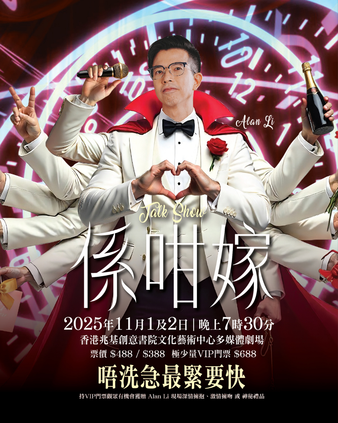 🎉【免費門票大放送!全港首個以婚宴為主題的 Talk Show!】🎤 MC Alan 去年全港首個以「婚宴」為主題嘅Talk Show 反應熱烈🔥今年主題源自無數新人趕急籌婚嘅爆笑(又爆吵🤣)實錄! 🎯 真實婚禮Juice現場:兄弟團選人👬 訂酒席驚魂 🍽️致辭災難😱無論係新婚夫婦、備婚新人、已婚人士、都會有所共嗚~ 📅 日期:2025年11月1–2日 ⏰ 時間:7.30pm - 10pm 📍 地點:兆基創意書院 - 多媒體劇院