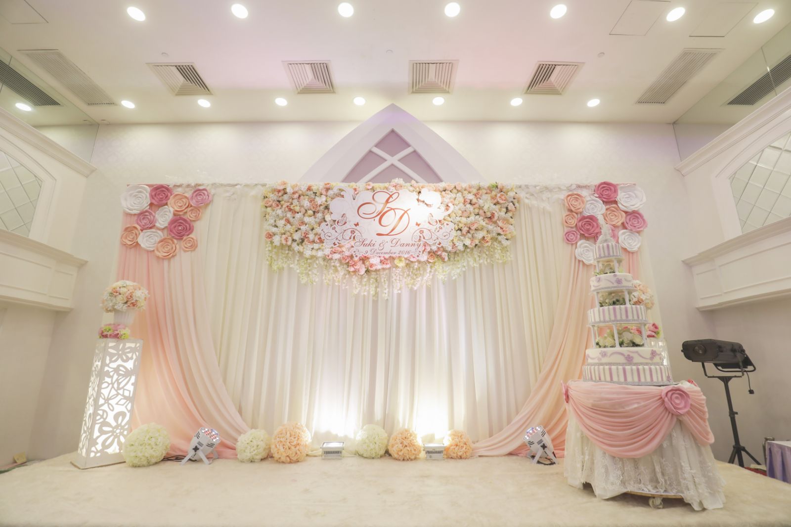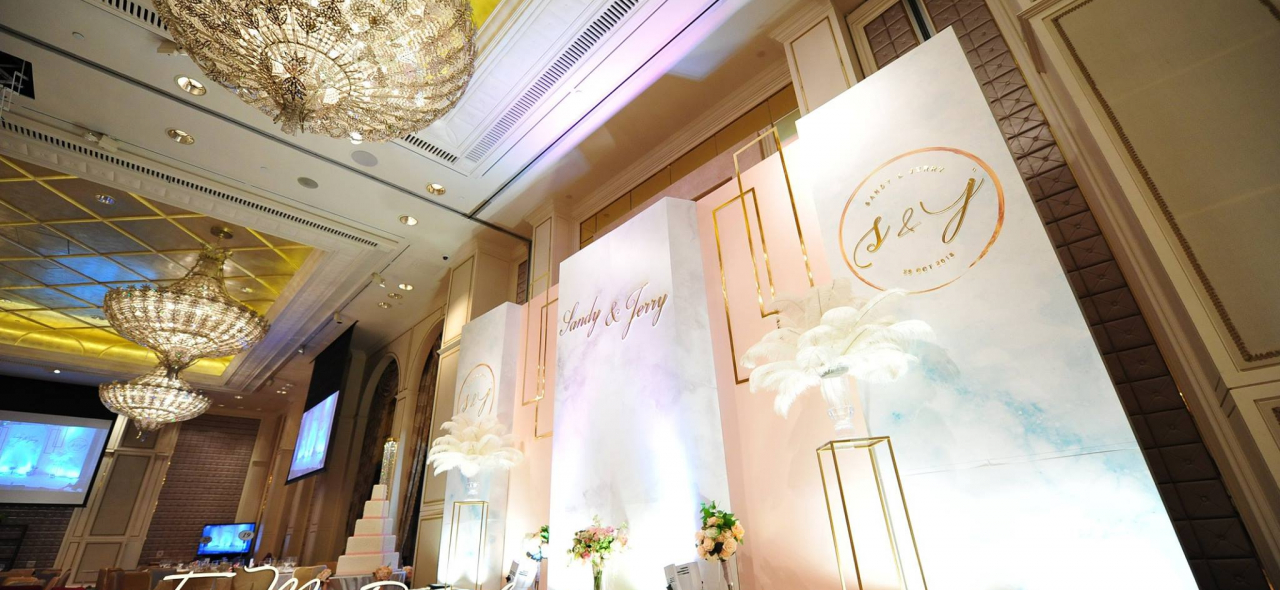 因為我喺彩福欣宴擺,佢個場嘅台面地氈係紫色,唔想啲相易出嚟暗,就想整個地氈白色。本身我淨係想整地氈,不過佢個package一定係包埋backdrop,咁就join咗。佢都有好多款式揀,揀T & M係因為佢哋比較pro啲,因為我哋有睇過其他佈置公司,嗰啲公司乜都話…