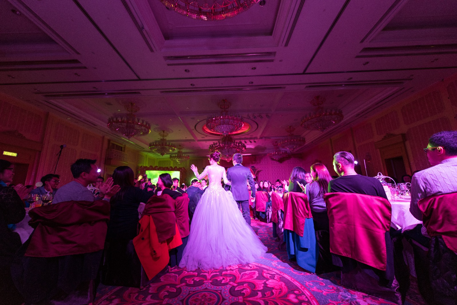 我係胡杏兒間KEVOLIE訂造咗胡定欣條視后裙,同我哋喺迪士尼個紫色皇室環境婚宴theme係好襯。其實之前我睇萬千星輝賀台慶胡定欣攞獎嘅時候,見到佢著住條裙出嚟就已經覺得好靚,後來睇報紙見到胡杏兒開婚紗鋪,可以租或訂造條裙,所以就訂咗!條裙真係九十九點九都一樣,只不過佢係白色底,我做咗紫色底,襯翻個紫色燈光。