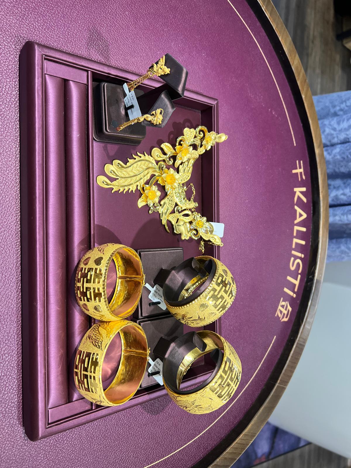 千金金業嘅款式偏向傳統,唔似珠寶店嗰啲咁新潮。不過我唔覺得係問題,因為租金器主要係用喺大日子,唔需要太潮流,最緊 要上身效果睇落得體🥳。嗰陣我基本上每一款都試戴過,先決定租邊啲。包括我同先生嘅金器,都有逐件試過,咁樣心入面都清楚大日子出嚟嘅效果會點。同事都有提醒我,唔好淨係揀最大、最密嗰啲金器。我試花鏈嗰陣,本身想揀條大啲、 密啲嘅,但同事話因為我嗰套褂啲刺繡都幾密,如果再配條太密嘅鏈,會搶咗件褂嘅效果🥹。佢建議我揀返一條兩層但有空位嘅花鏈,咁樣可以睇清楚褂嘅刺繡。最後我聽咗同事嘅建議,效果真係好好☺️。呢個就係千金金業專業嘅地方,會諗埋整體嘅搭配🥰。