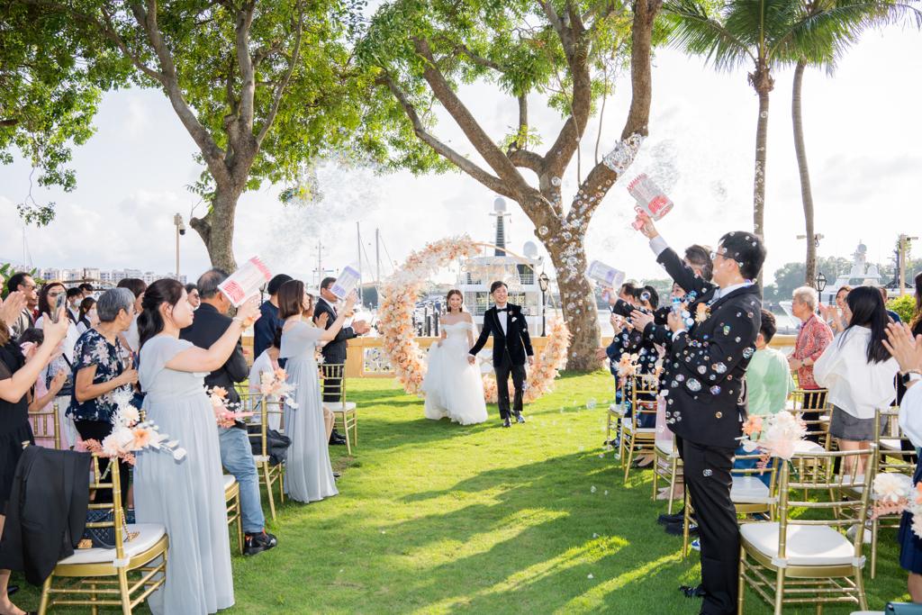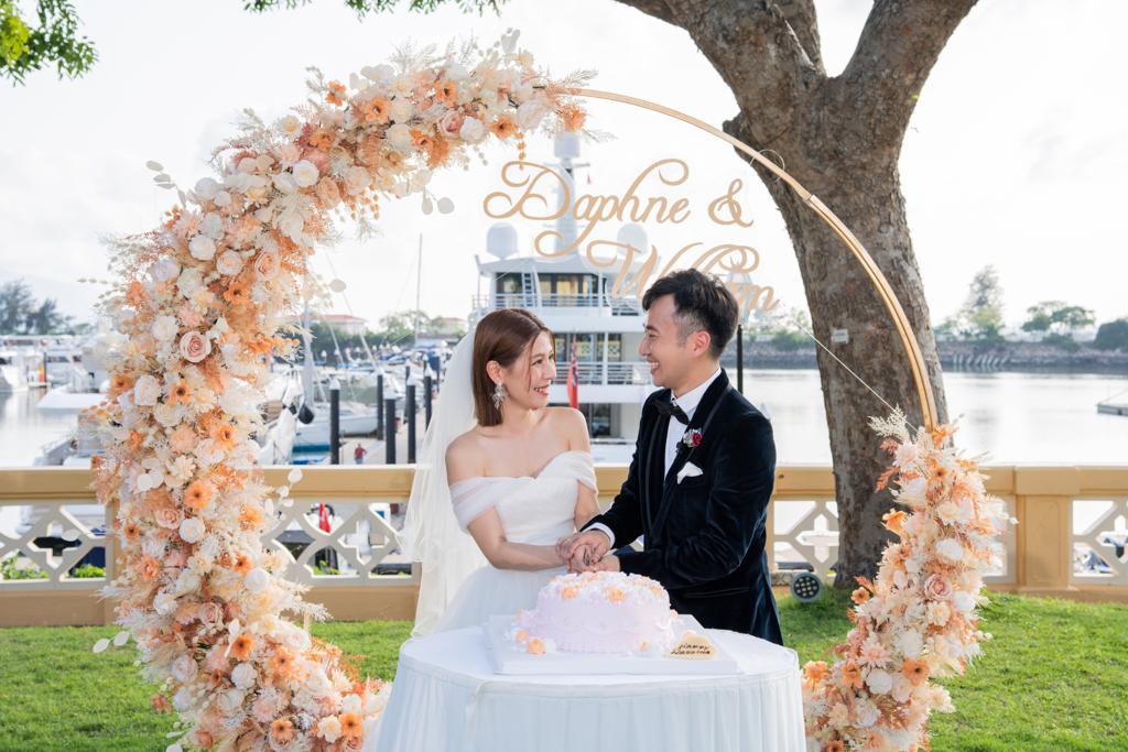我哋去到嗰日walk in其實冇得睇場,但負責人Nette見預約咗嘅客人未到,就帶我哋去行一圈睇睇。我哋行一圈嘅時候剛好有另一對新人證緊婚,成個效果睇落都覺得幾好!最吸引我係佢哋草地個場地,一入去就覺得嗰度好靚😆。佢哋塊草地好靚、望住海有遊艇,同埋最重要係證婚位置正後方就會見到日落嘅鹹蛋黃!(我哋自己證婚啲相影出嚟有日落真係好靚)我都睇過好多其他場地,但係其他草地場都冇佢呢度咁出色👍🏻。另一個吸引我哋嘅地方係一條龍服務好方便,佢哋好多嘢都安排好晒唔使你再去搵。我哋join咗120人嘅草地戶外證婚同埋buffet晚宴,包埋證婚律師,下午4:00證婚有cocktail、小食同結婚蛋糕,然後8點就開始晚宴。Nette另外介紹咗一間相熟嘅deco公司,我哋睇完都覺得幾好,就join咗。